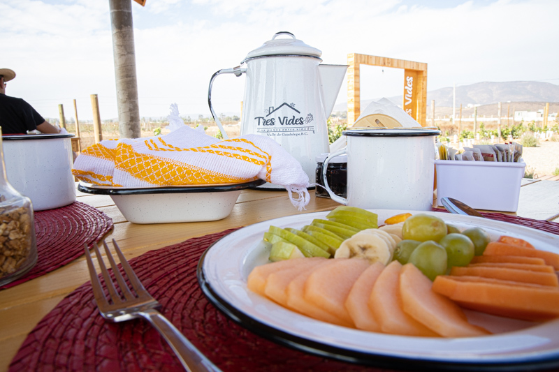 Otro de los puntos destacables de Tres Vides es su desayuno continental incluido, y digo destacable ya que son pocos los hoteles en Valle de Guadalupe que lo ofrecen. Además, no solo es basto en su porción, sino que también es delicioso, con un increíble pan recién horneado cada mañana.